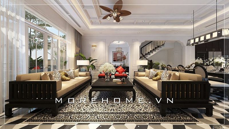 Thiết kế nội thất phòng khách theo phong cách gỗ Việt sang trọng và ấm cúng để làm nên sự đẳng cấp của gia chủ.